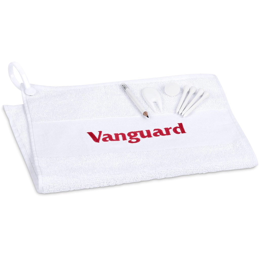This neatly packaged golf set is a great gift for golf days. It includes a 400g/m2 cotton golf towel, mini pencil with eraser, divot tool, ball marker and four golf tees. PVC pouch: 16 ( h ) x 8.5 ( d ) cm golf towel: 50 ( l ) x 35 ( w ) cm 400g/m2, 100% cotton plastic carabiner on towel to clip on golf bag flat strip woven into the towel for branding mini pencil with eraser divot tool ball marker four golf tees packaged in a pouch