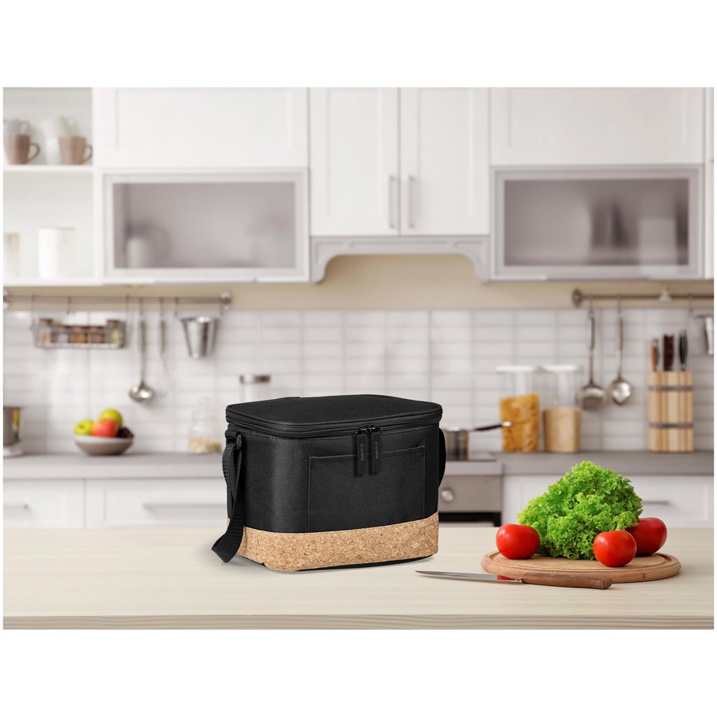 The cork base of this sturdy 6-can cooler gives it an appealing natural look and feel. Use it to keep your drinks cool or as a lunch bag. 23 ( w ) x 15.5 ( d ) x 17 ( h ) cm 600D & cork with PEVA lining padded grey PEVA lining front pocket for vibrant coloured branding adjustable shoulder strap cork bottom panel bulk packed