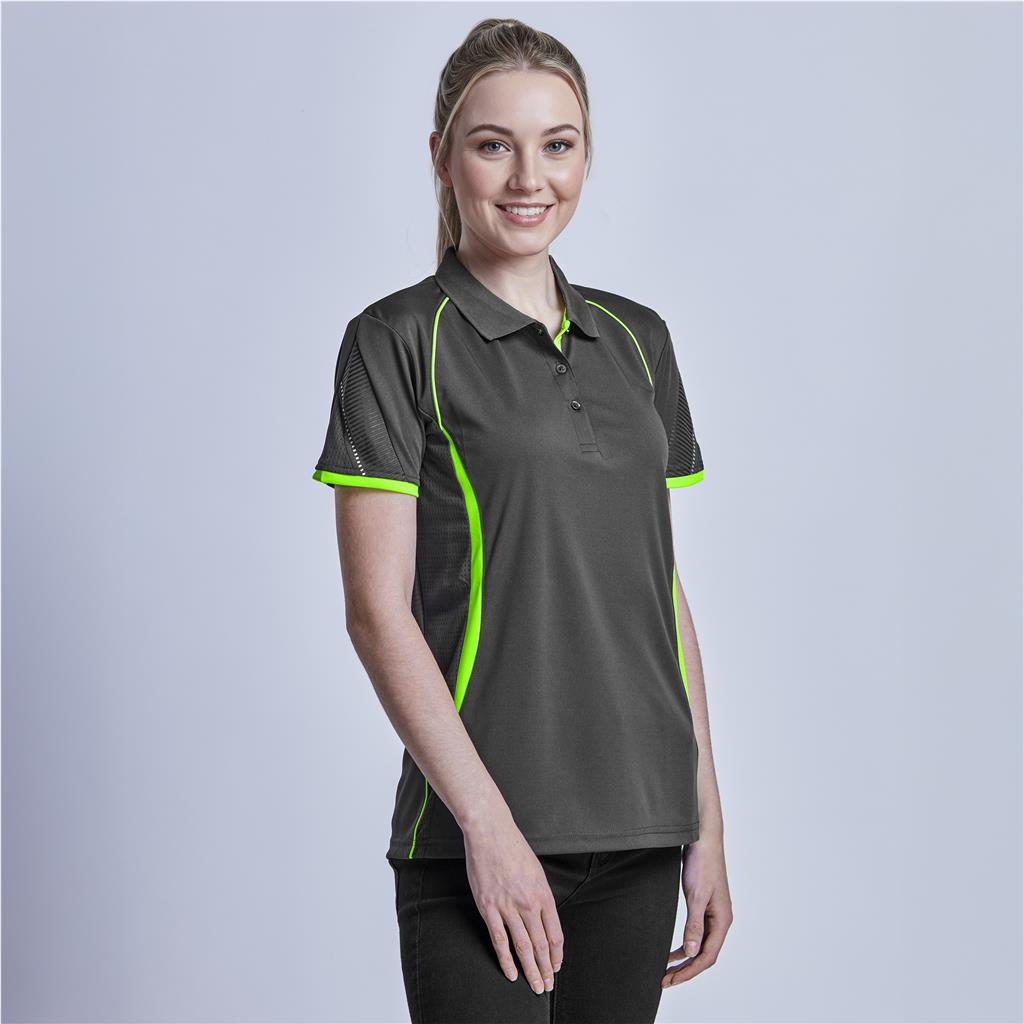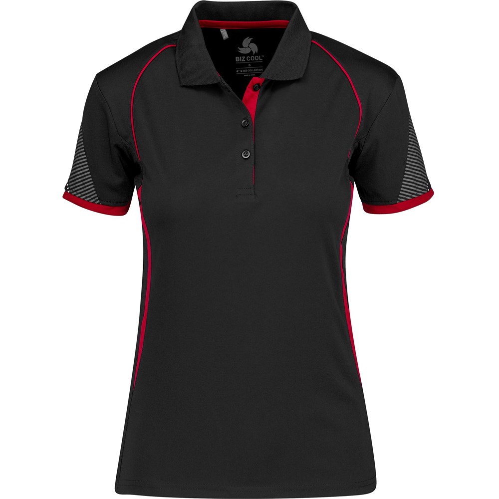 155 g /m² 100% BIZ COOLTM polyester polyester sports interlock fabric with UPF Rating excellent knitted collar contrast piping at placket edge grid mesh underarm panels for breathability unique sleeve print feature contrast panels and piping narrow three button placket